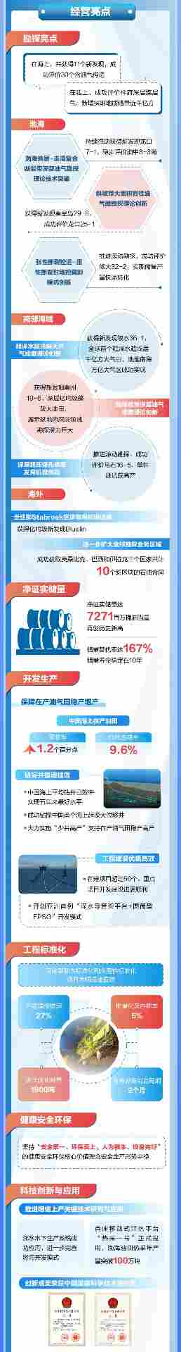 坚持可持续发展理念,注重生产安全,积极探索绿色转型路径。公司有效应对超强台风“摩羯”等挑战,确保海上油气田生产稳步运行。油气资源绿色低碳生产取得实效,中国海上首个全方位绿色设计的乌石23-5油田群建成投产,渤海岸电工程三期项目全面投用,全年通过岸电工程等共实现绿电替代7.6亿千瓦时。年内,全球首座16兆瓦级张力腿型浮式风电平台项目开工,设计年均发电量5400万千瓦时。与此同时,稳妥推进零碳负碳产业,大亚湾CCS/CCUS(二氧化碳捕集、利用及封存)示范项目扎实推进,积极打造渤海和海南两个海上CCUS基地。