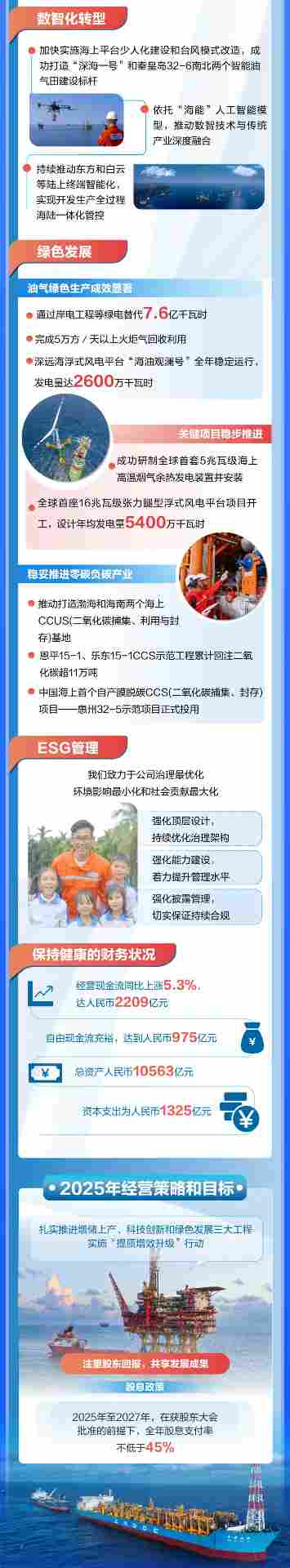 董事长汪东进表示:“2024年,我们以技术创新驱动增储上产,以成本优势筑牢发展根基,以稳定分红回馈股东信任。展望未来,中国海油将坚定不移地推进增储上产举措,实施提质增效升级行动,以实干实绩更好地回报股东,奋力谱写高质量发展新篇章。”