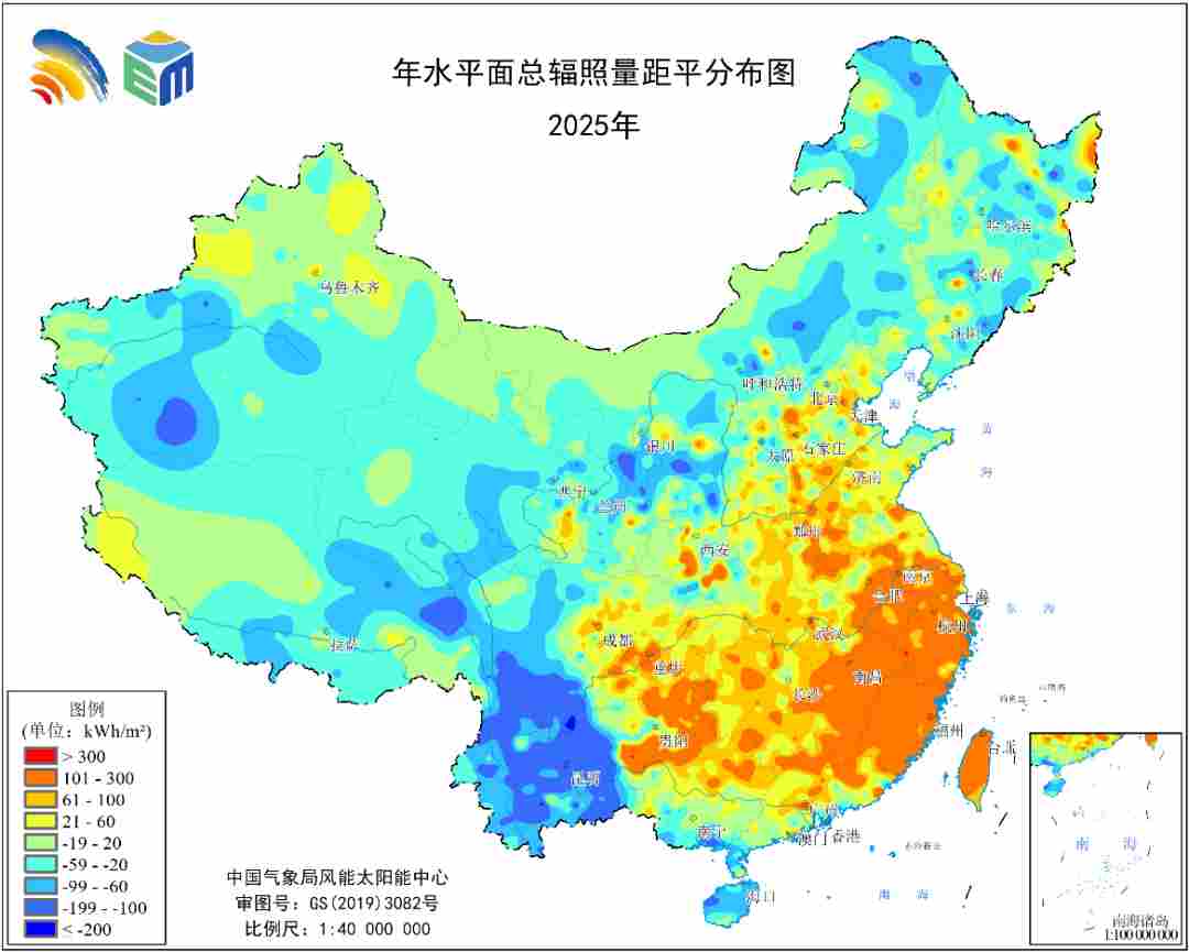2025年全国陆地年水平面总辐照量距平分布(单位:kWh/m²)