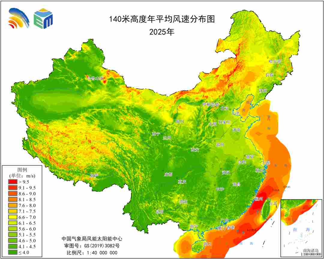 2025年全国陆地及部分海上区域140米高度年平均风速分布(单位:m/s)