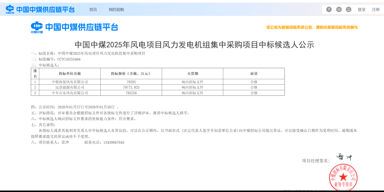 1月30日,中船科技喜迎2026年业务拓展“开门红”,成功中标中国中煤2025年风电项目风力发电机组集中采购核心标段,拿下中新海螺明光市岭东、岭西50万千瓦风电场项目,中标金额达7.92亿元,以实打实的业绩为“十五五”开局之年注入澎湃动能。