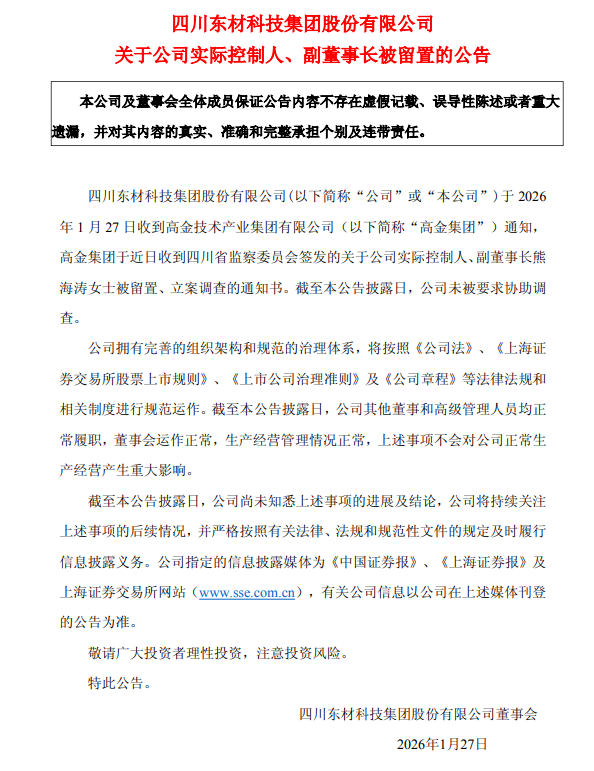 1月28日,四川东材科技集团股份有限公司发布公告称,公司于2026年1月27日收到高金技术产业集团有限公司(以下简称“高金集团”)通知,高金集团于近日收到四川省监察委员会签发的关于公司实际控制人、副董事长熊海涛女士被留置、立案调查的通知书。截至本公告披露日,公司未被要求协助调查。