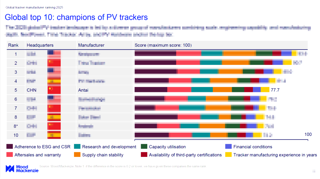 近日,国际知名能源咨询机构伍德麦肯兹(Wood Mackenzie)发布《2025 年上半年全球光伏跟踪器制造商排名报告》(Global tracker manufacturer ranking 2025 H1)。报告显示,在 2025 上半年全球光伏跟踪器制造商排名中,安泰新能源成功跻身全球第 5 位,中国第三,同时获评“全球 A 级跟踪器制造商”,展现出强劲的市场竞争力与品牌影响力。