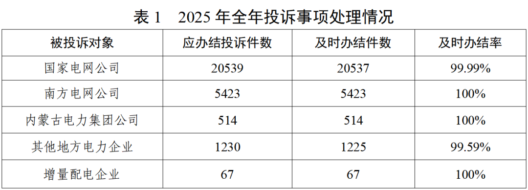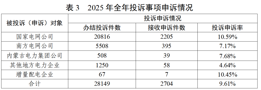 2025年全年,办结投诉事项28149件(含上年结转),热线平台接收申诉事项2704件,投诉申诉率9.61%;其中,涉及国家电网公司2205件、南方电网公司395件、内蒙古电力集团公司39件、其他地方电力企业58件、增量配电企业7件。