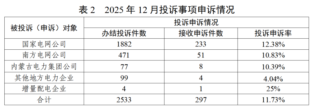 2025年12月,办结投诉事项2533件(含上月结转),热线平台接收申诉事项297件,投诉申诉率11.73%;其中,涉及国家电网公司233件、南方电网公司51件、内蒙古电力集团公司8件、其他地方电力企业4件、增量配电企业1件。