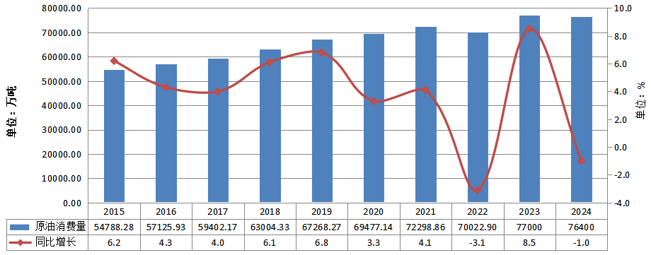 根据中国石油和化学工业联合会的统计数据,2024年,我国原油表观消费量7.64亿吨,同比下降1.0%。2024年,受国内宏观经济结构性调整、替代能源加速发展等因素影响,国内原油消费增长动力不足,在此背景下,原油表观消费量出现同比下降,从消费结构看,体现为“交通用油下降、化工用油上升”的消费格局。