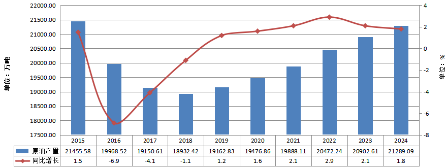 图3-2 2015—2024年原油产量及增长情况