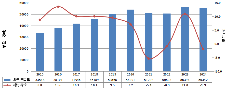 图3-3 2015—2024年原油进口量及增长情况