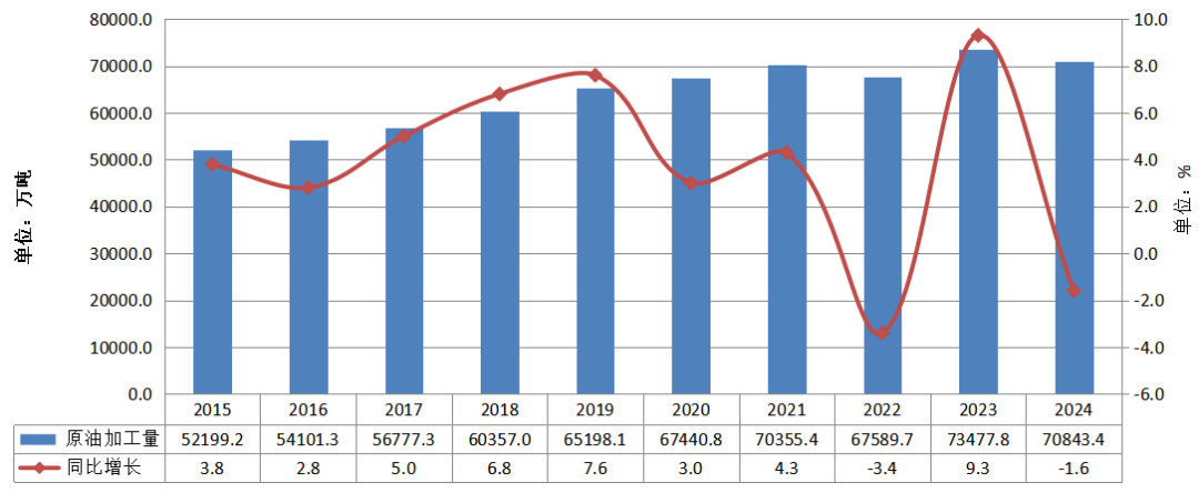国家统计局数据显示,2024年,我国原油加工量70843.4万吨,同比下降1.6%。这主要是受到成品油市场收缩和下游需求不旺的影响,炼化企业“油转化”“油转特”成为主要趋势。在国内经济运行稳健、能源需求稳步提升的背景下,近年来我国原油加工量水平波动提升。我国原油加工量于2018年突破6亿吨,于2019年突破6.5亿吨,于2021年突破7亿吨。最近两年全球能源市场局势动荡,国内炼化行业在优化结构的同时,适度调整开工负荷,原油加工量亦有波动,但整体维持稳健水平。目前,国内原油加工水平仍然保持7亿吨以上。