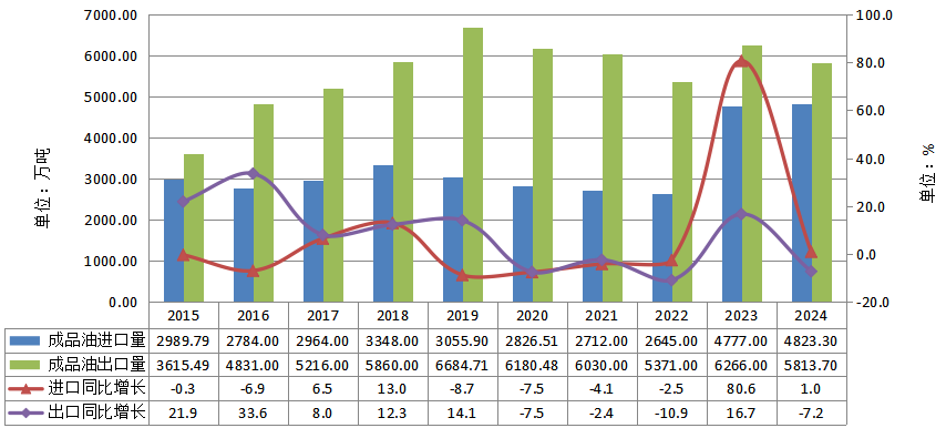 图3-8 2015—2024年成品油进出口量及增长情况