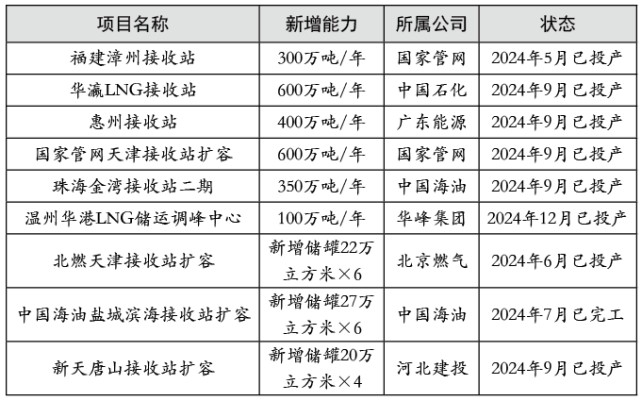 2024年,新投运的接收站有国家管网漳州一期(接收能力达300万吨/年)、广东能源集团惠州(接收能力达400万吨/年)、中国石化潮州华瀛(接收能力达600万吨/年)、北京燃气天津南港二三期、温州华港LNG接收站一期(接收能力达100万吨/年)、新天绿色能源唐山LNG接收站二阶段及国家管网天津二期(接收能力达600万吨/年)等,合计新增LNG接收能力2350万吨/年,进口资源供应显著增加。