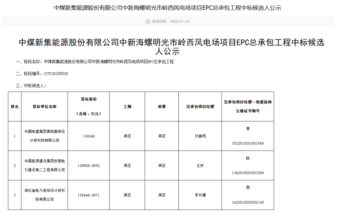 根据公示,中新海螺明光市岭西风电场项目EPC总承包工程第一中标候选人为中国电建集团贵阳勘测设计研究院有限公司,投标报价为138240万元。