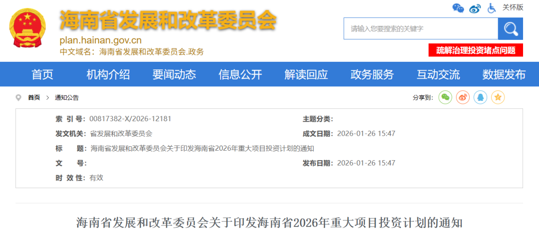 北极星风力发电网获悉,1月26日,海南省发展和改革委员会发布《关于印发海南省2026年重大项目投资计划的通知》。