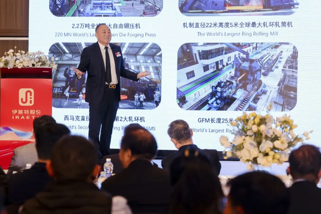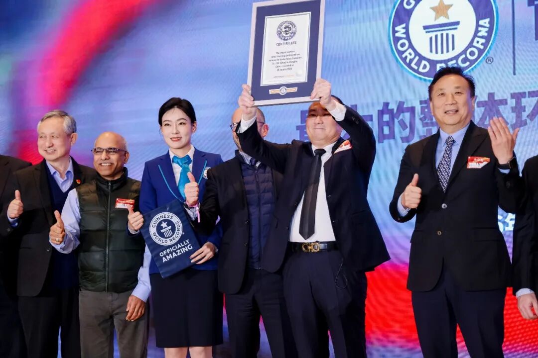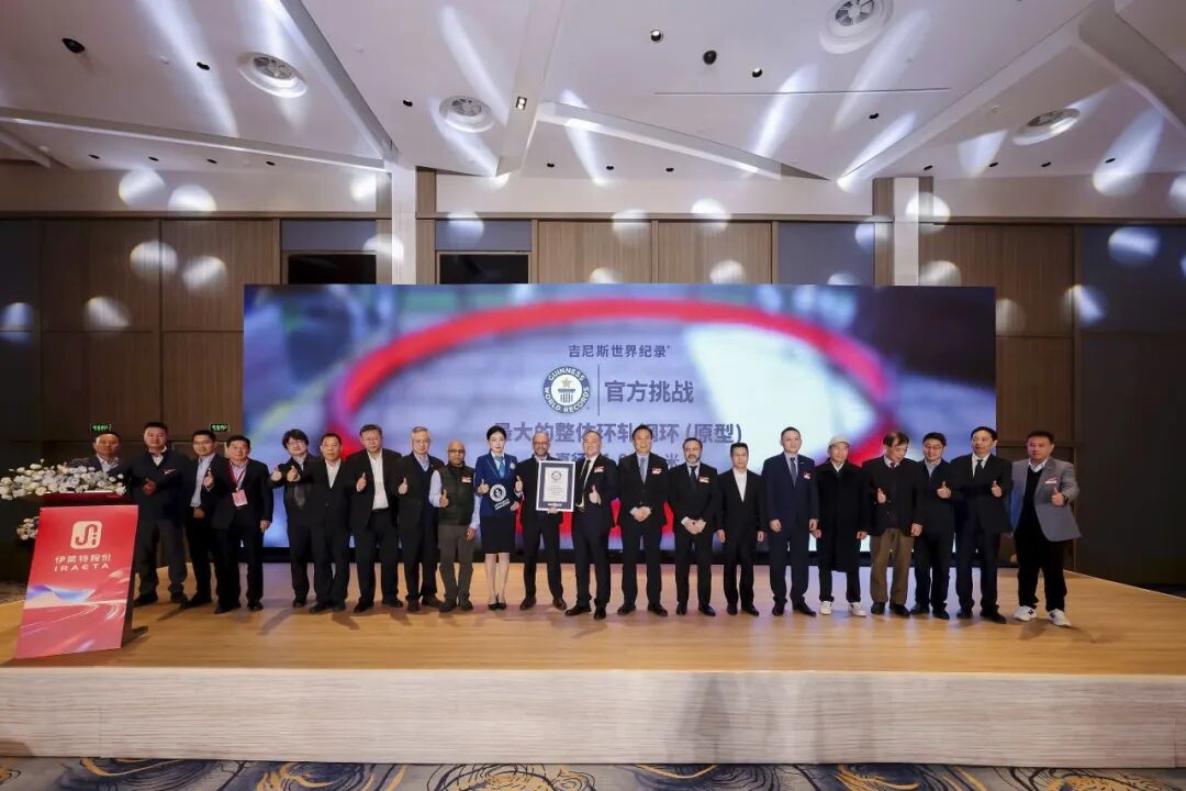 发布会现场,吉尼斯世界纪录认证官侯颖为牛余刚董事长颁发“吉尼斯世界纪录最大的整体环轧钢环(原型)”认证证书,凭借直径21.0294米的新纪录,伊莱特打破了自己于2022年创造的吉尼斯世界纪录,创造了人类历史上新的工业奇迹。