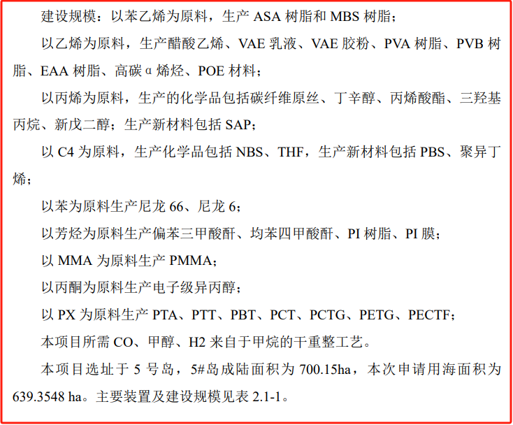 该报告除了介绍项目建设的相关内容,比如项目选址在裕龙岛5#岛等,还提及了裕龙石化下游及延伸产业链中涉及的石化项目建设内容。