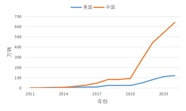 图2 2011—2024年中美两国纯电动汽车销量