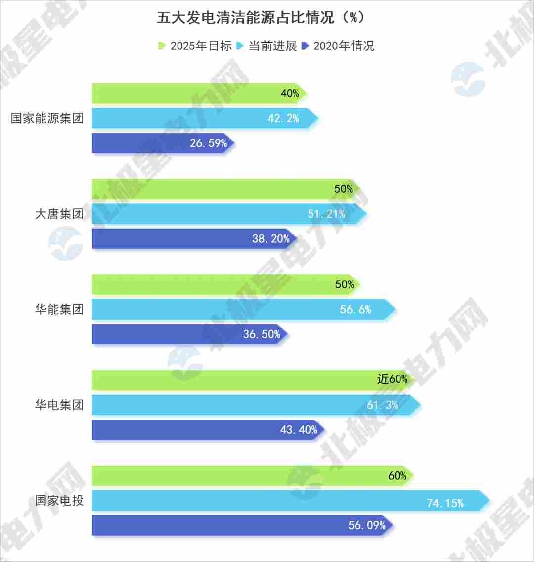 随着“十四五”收官,五大发电均已完成清洁能源装机占比目标。国家电投“一马当先”,清洁能源占比(74.15%)在五大发电中依旧占据首位,华电集团以61.3%位居第二,华能、大唐占比均超50%;国家能源集团清洁能源占比达42.2%。