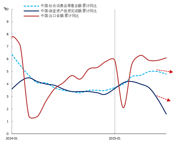 图2: 2024-25年中国出口、投资与消费累计同比增速