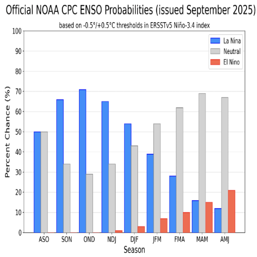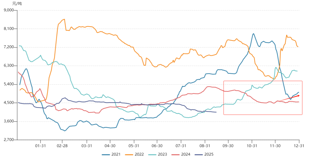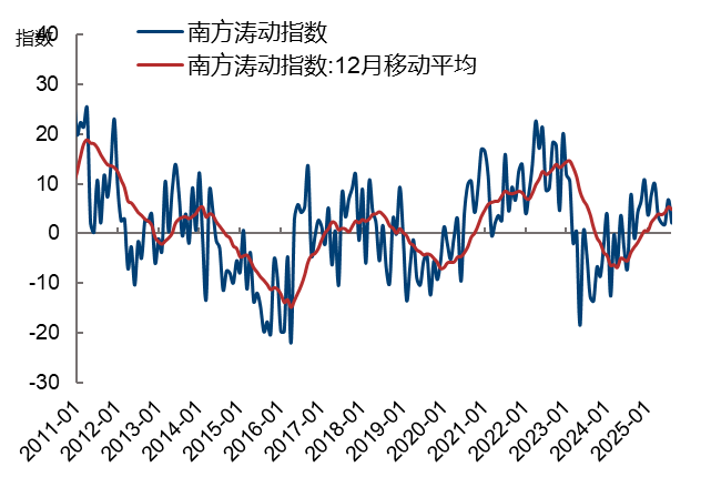 2025年8月开启冬季补库。从当前南方涛动指数(SOI)以及美国海洋与大气管理局(NOAA)8月发布的ENSO指数来看,2025-26冬季拉尼娜概率接近60%,目前看冬季冷冬概率上升(距离冬季时间较长,2025年副热带高压不活跃,冬季气温预期偏低,密切关注)。