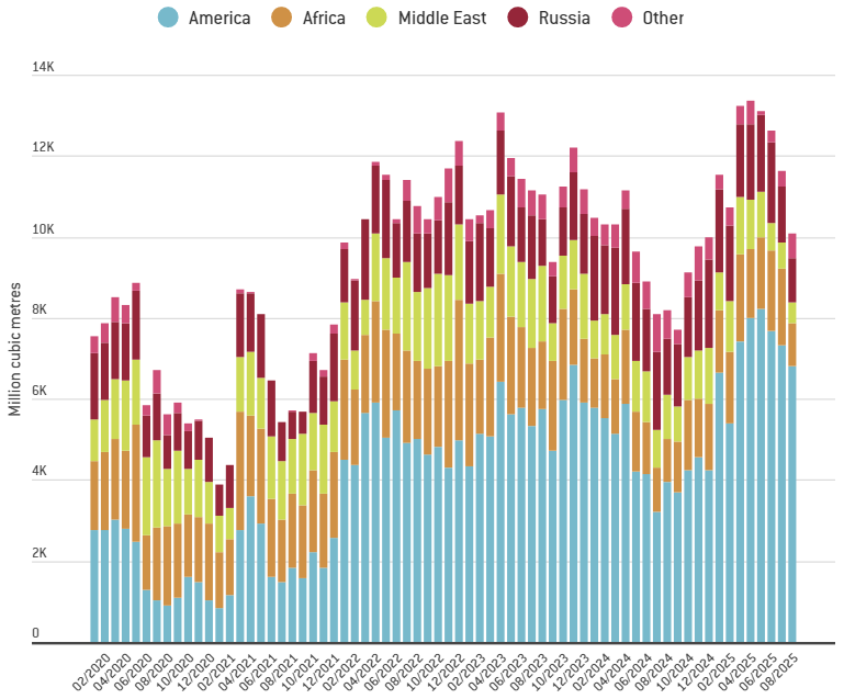 2025年9月,美国所有盆地天然气钻机数达到118台,较2024年102台有回升。2025年9月美国天然气供气量达到1120亿立方英尺/天——2025年美国向欧洲LNG供气量持续上升(图6)。
