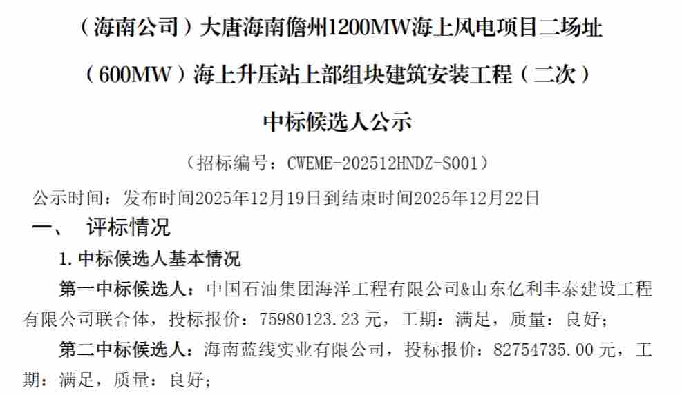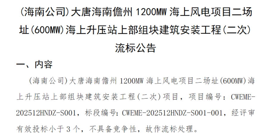 公告显示,(海南公司)大唐海南儋州1200MW海上风电项目二场址(600MW)海上升压站上部组块建筑安装工程(二次)项目,经评审有效投标小于3个,不具备竞争性,故作流标处理。