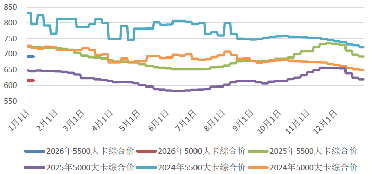 进口煤市场方面,本周整体呈现“供应收紧推动价格普遍上涨”的格局。印尼RKAB审批进度缓慢以及政府计划将2026年煤炭产量目标设定在6亿吨以下,叠加主产区降雨等传统因素和苏门答腊公路禁运等影响,导致1月份现货供应紧张。同时,虽未正式执行但持续酝酿的分级出口关税政策,致使未来出口成本预期增加,进一步强化了其挺价心态。印尼Q3800(低卡)FOB报价周环比上涨1-3美元/吨,至49.5-51美元/吨;澳煤Q5500(高卡)报价也小幅上调至75-76美元/吨。俄罗斯煤方面,由于国内终端电厂等用户库存充足,采购意愿不强;同时,贸易商考虑到采购成本与到岸销售价格依然倒挂的风险,新货采购积极性也不高。供需双方的谨慎心态,导致市场报还盘存在价差,实际成交困难。由于国内港口煤价出现小幅反弹,进口煤价格优势对比发生变化,其中,印尼低卡煤(如Q3800)仍保持一定的价格优势,价格涨幅明显;而对于高卡煤(如澳煤Q5500),由于到岸成本与内贸煤价差显著收窄、甚至出现倒挂,性价比优势减弱,价格上涨乏力,成交较为冷清。短期内,预计进口煤市场将维持“高位震荡”格局。
