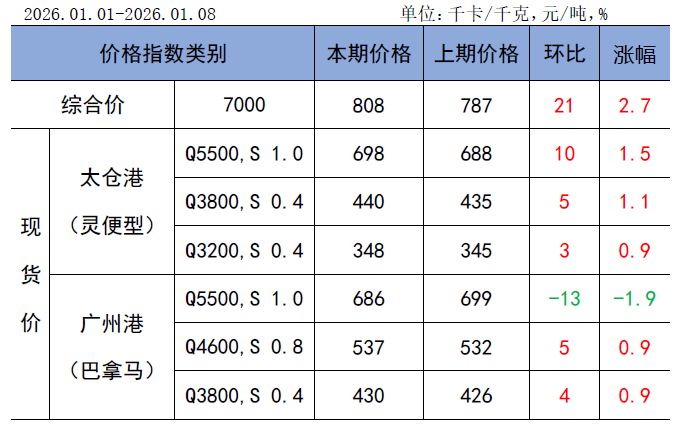 CECI进口指数到岸标煤单价808元/吨,较上期上涨21元/吨,环比涨幅2.7%。本期各煤种采购价格除广州港(巴拿马型)5500千卡/千克价格下降13元/吨外,均有不同程度上涨,其中太仓港(灵便型)5500千卡/千克、广州港(巴拿马型)4600千卡/千克价格环比分别上涨10元/吨、5元/吨。本周进口煤现货市场呈现“跌势企稳,结构优化”特征。从采购情况看,市场货盘供应维持宽松。从实际成交看,样本量环比小幅增加,预示买方采购意愿已出现改善。从交货期看,本周样本交货期主要集中在2月中旬。
