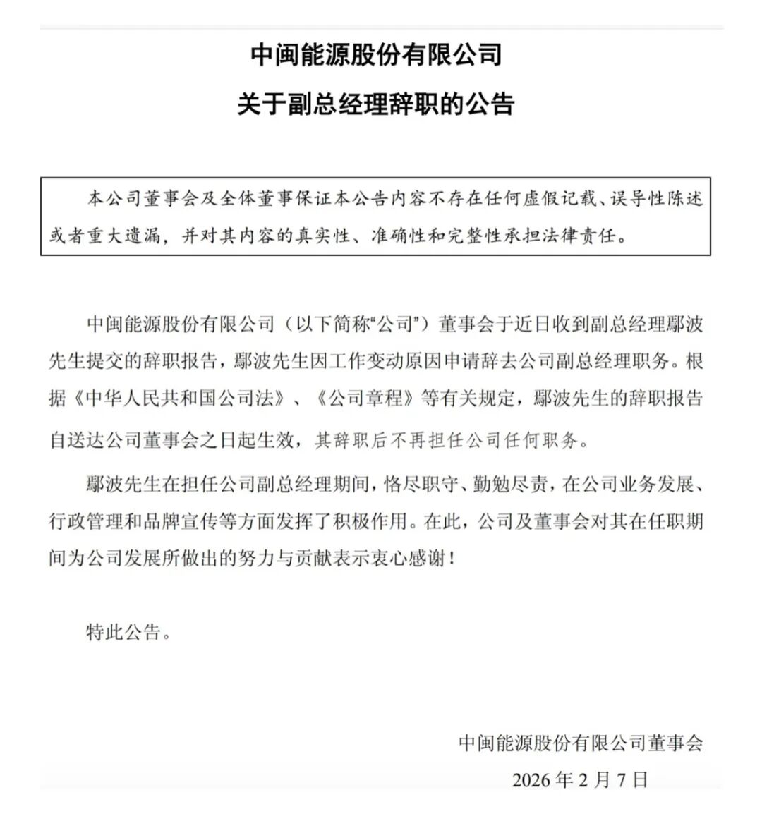 2月7日,风电开发商中闽能源发布公告称,鄢波先生因工作变动原因申请辞去公司副总经理职务。鄢波先生的辞职报告自送达公司董事会之日起生效,其辞职后不再担任公司任何职务。