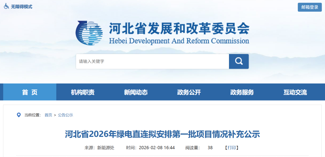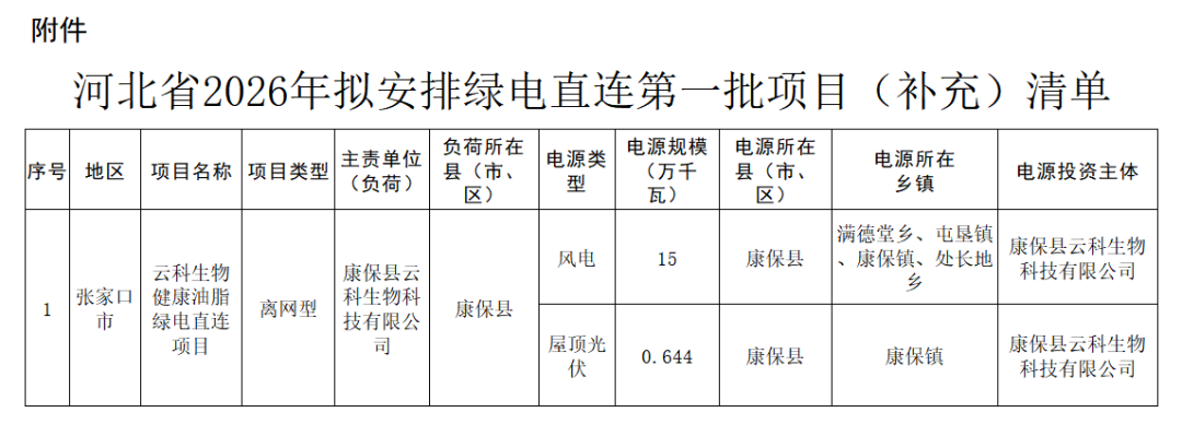 2026年2月6日,河北省发改委先后发布《河北省2026年绿电直连拟安排第一批项目情况公示》、《河北省2026年绿电直连拟安排第一批项目情况补充公示》。