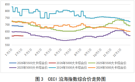 CECI沿海指数5500千卡/千克现货成交价较上期上涨2元/吨,5000千卡/千克现货成交价较上期持平。从样本情况看,本期5500千卡/千克、5000千卡/千克规格品现货成交价样本价格区间分别为689-698元/吨、610元/吨。从样本热值分布看,5500千卡/千克、5000千卡/千克、4500千卡/千克样本在总量中占比分别为18.2%、55.3%、26.5%。