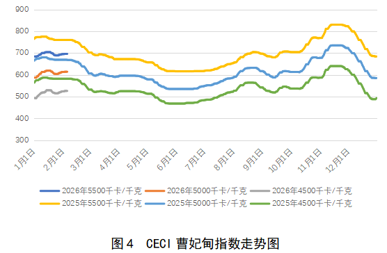 CECI曹妃甸指数5500千卡/千克、5000千卡/千克和4500千卡/千克平均价格分别为695.8元/吨、614元/吨和525.8元/吨,分别比上期平均价格上涨4.8元/吨、6.6元/吨和7.4元/吨。从样本情况看,本期曹妃甸指数日均现货交易数量较上期小幅增加,其中5500千卡/千克、4500千卡/千克样本数量略有增加,5000千卡/千克样本数量基本持平。