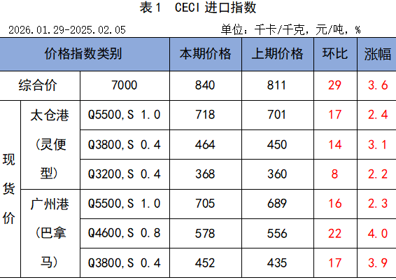 CECI进口指数到岸标煤单价840元/吨,较上期上涨29元/吨,环比涨幅3.6%。本期各煤种采购价格均有不同程度上涨,其中太仓港(灵便型)5500千卡/千克价格、广州港(巴拿马型)4600千卡/千克价格环比分别上涨17元/吨、22元/吨。本周进口煤现货市场呈现“供应紧张主导,需求放量跟涨”特征。从采购情况看,货源供应偏紧的格局未改,现货报盘数量整体偏少。从实际成交看,市场活跃度进一步攀升,本周采购样本量已高于年度平均值,终端采购意愿在本轮上涨行情中有所释放。从交货期看,本周样本交货期主要集中在3月中旬。