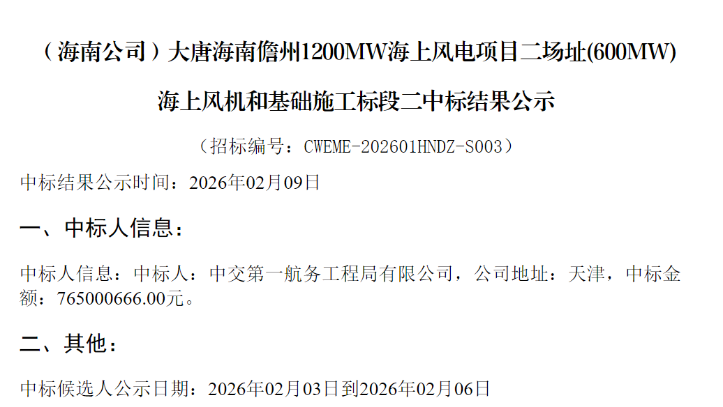 北极星风力发电网获悉,2月9日,大唐海南儋州1200MW海上风电项目二场址(600MW)海上风机和基础施工标段一、标段二中标结果公示。