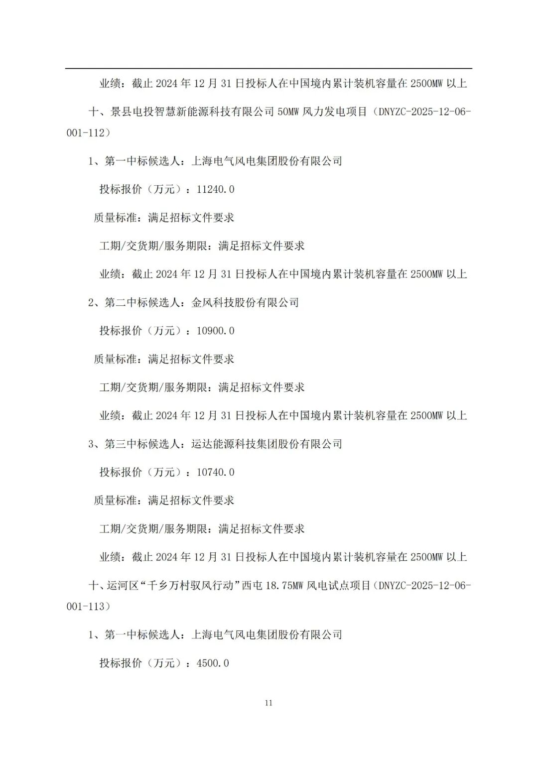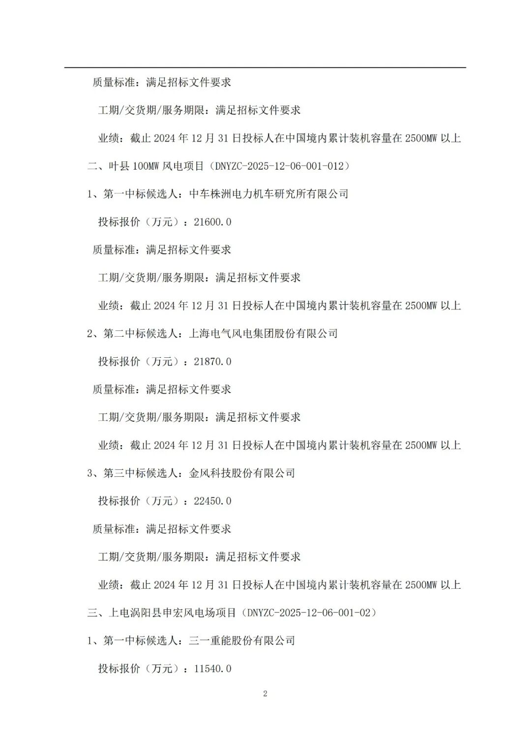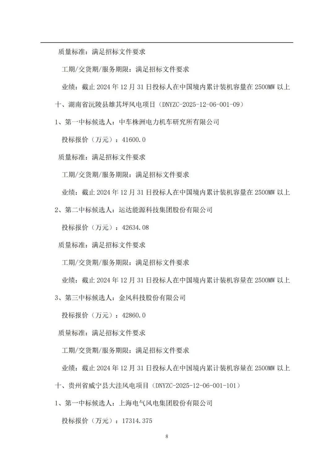 其中:电气风电预中标636.25MW,运达股份预中标516.25MW,金风科技预中标500MW,远景能源预中标500MW,中车株洲所预中标400MW,三一重能预中标150MW,东方风电预中标50MW。