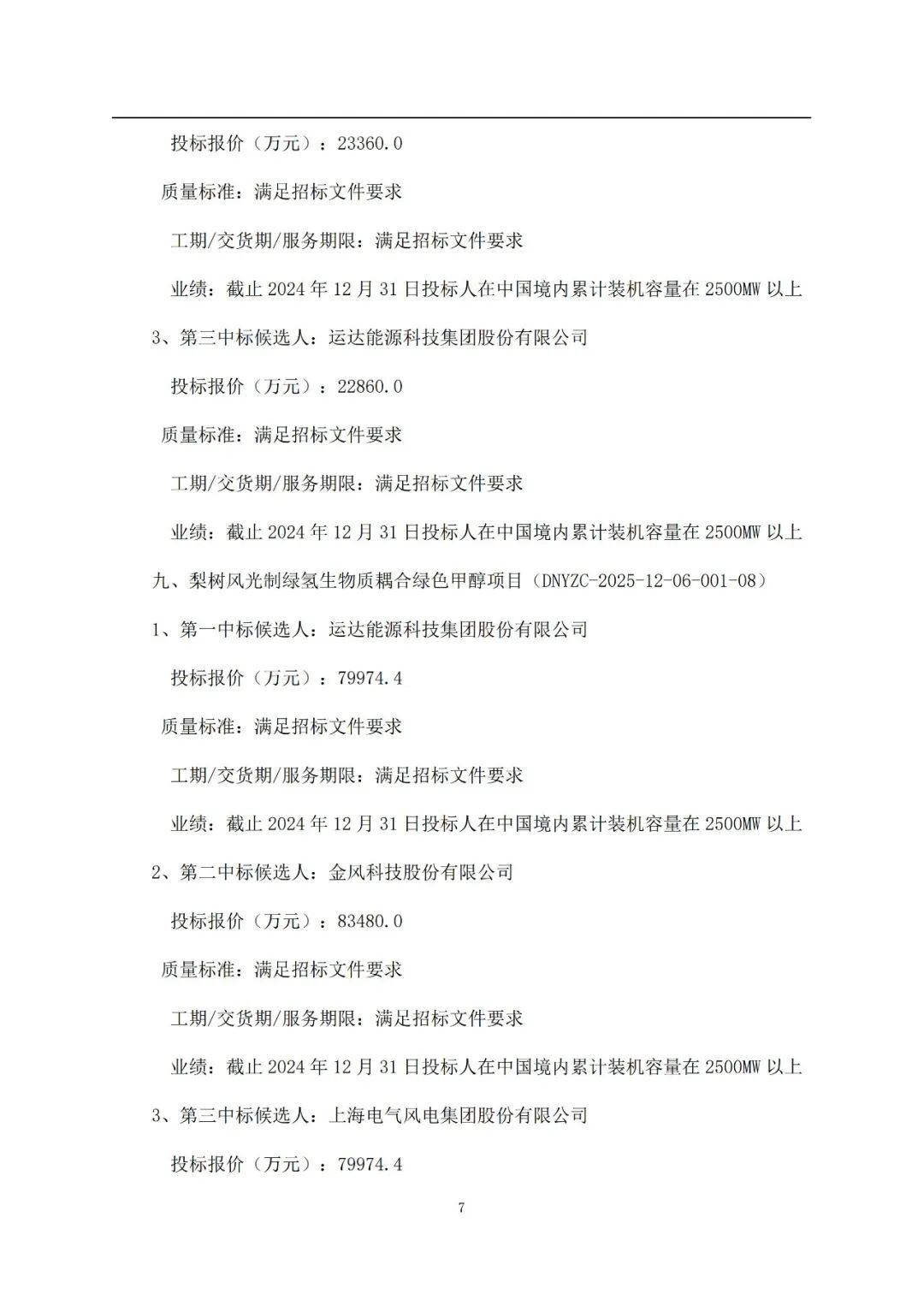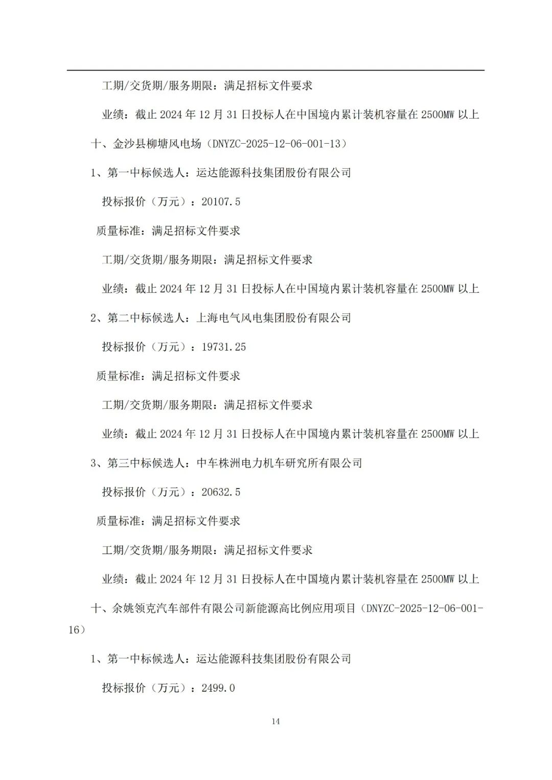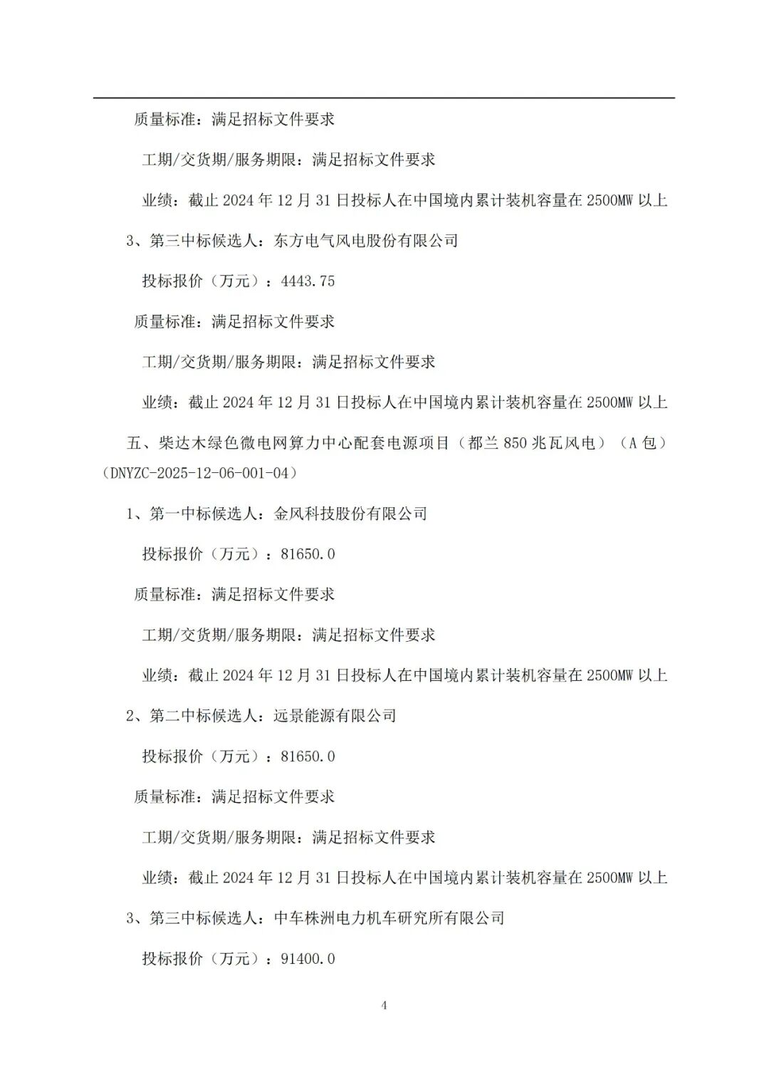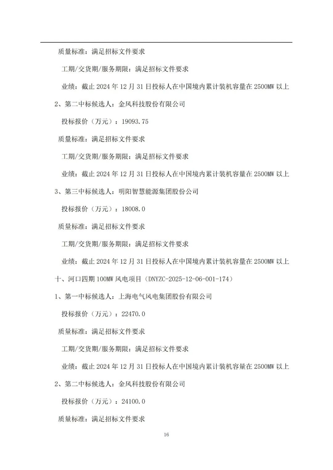 其中:电气风电预中标636.25MW,运达股份预中标516.25MW,金风科技预中标500MW,远景能源预中标500MW,中车株洲所预中标400MW,三一重能预中标150MW,东方风电预中标50MW。