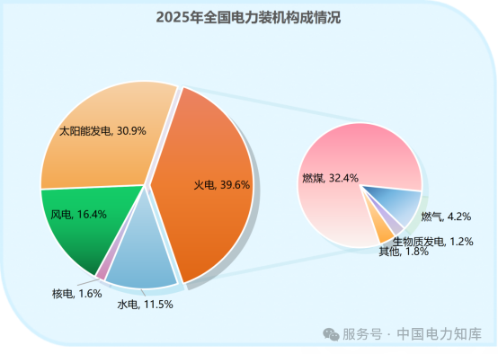 截至2025年底,全国全口径发电装机容量38.9亿千瓦,同比增长16.1%。分类型看,水电4.5亿千瓦,占全部装机容量的11.5%;火电15.4亿千瓦,占全部装机容量的39.6%;核电6248万千瓦,占全部装机容量的1.6%;并网风电6.4亿千瓦,占全部装机容量的16.4%;并网太阳能发电12.0亿千瓦,占全部装机容量的30.9%。