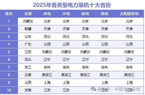 这些装机主要分布在哪些省份呢?截至2025年底,不同类型电力装机的前十省份,如下表所示。