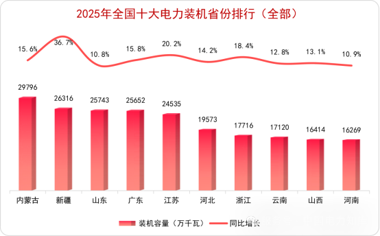 截至2025年底,全国十大发电装机省份分别是:内蒙古29796万千瓦、新疆26316万千瓦、山东25743万千瓦、广东25652万千瓦、江苏24535万千瓦、河北19573万千瓦、浙江17716万千瓦、云南17120万千瓦、山西16414万千瓦、河南16269万千瓦。