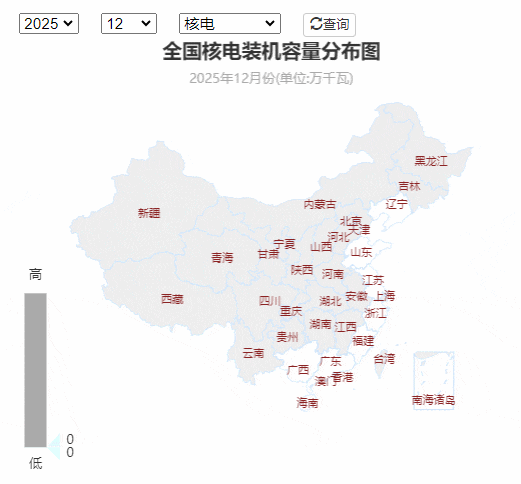 2025年,全国核电装机容量达6248万千瓦,同比增长2.7%,占全部装机容量的1.6%。全国核电装机容量分布图如下所示。