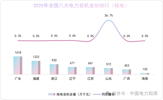 截至2025年12月底,全国八大核电装机省份分别是:广东1618万千瓦、福建1222万千瓦、浙江920万千瓦、辽宁671万千瓦、江苏661万千瓦、山东572万千瓦、广西453万千瓦、海南130万千瓦。