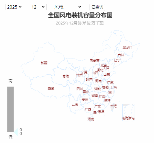 2025年,全国并网风电装机容量达64001万千瓦,同比增长22.9%,占全部装机容量的16.4%。全国风电装机容量分布图如下所示。