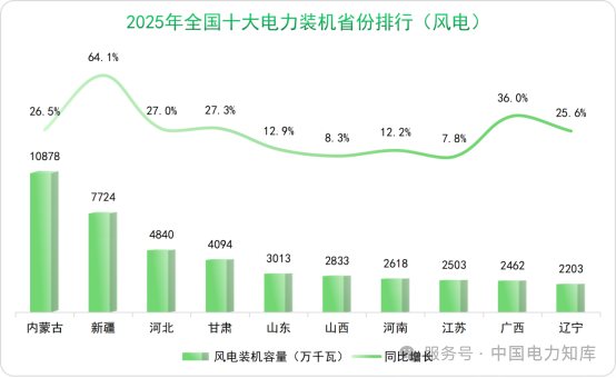 截至2025年底,全国十大风电装机省份分别是:内蒙古10878万千瓦、新疆7724万千瓦、河北4840万千瓦、甘肃4094万千瓦、山东3013万千瓦、山西2833万千瓦、河南2618万千瓦、江苏2503万千瓦、广西2462万千瓦、辽宁2203万千瓦。