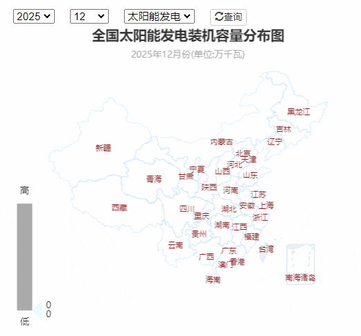 2025年,全国并网太阳能发电装机容量达120173万千瓦,同比增长35.4%,占全部装机容量的30.9%。全国太阳能发电装机容量分布图如下所示。