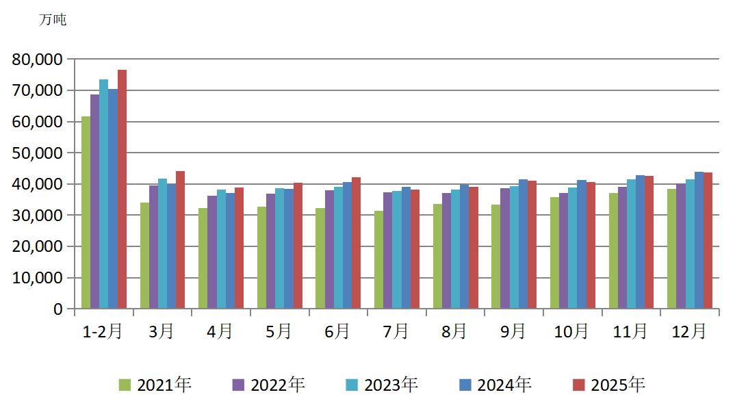 ◆“双碳”目标下,我国积极推进能源绿色低碳转型,煤炭消费比重持续下降,清洁能源消费占比稳步攀升,消费结构进一步优化。据国家统计局初步测算,2025年全社会能源消费总量比上年增长3.5%,扣除原料用能和非化石能源消费量后,单位GDP能耗比上年降低5%以上。2025年,我国主要耗煤行业产品产量走势分化,煤炭消费同比略有下降,其中电力、钢铁、建材用煤同比下降,化工用煤同比增长。