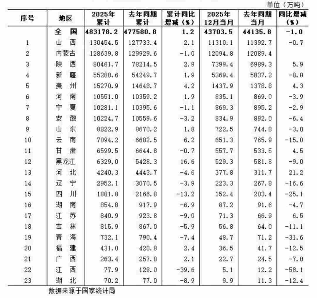 表1 2025年全国规模以上企业原煤产量(分地区)