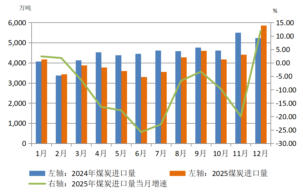 2025年2月以来我国煤炭进口量同比持续减少,直至12月我国进口煤炭5859.7万吨,超过了2024年11月的5498万吨,再创历史新高;较上年同期的5234.6万吨增加625.1万吨,同比增长11.9%;较11月份的4405.3万吨增加1454.4万吨,环比增长33.0%。2025年全年我国煤炭进口总量虽同比下降9.6%至4.9亿吨,但仍处于历史第二高位。