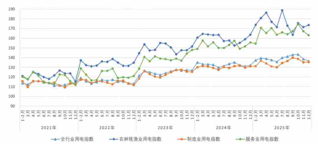 根据中电联发布的2025年12月全国电力消费系列指数(CNECI),12月,全国全行业用电指数为136.6,全行业用电量比2020年基期(以2020年基期为100)增长了36.6%,年均增长6.4%,同比增长3.4%,增速比上月回落2.3个百分点。其中,12月,农林牧渔业用电指数为173.6,比2020年基期增长了73.6%,年均增长11.7%,同比增长6.1%;制造业用电指数为135.4,比2020年基期增长了35.4%,年均增长6.3%,同比增长3.4%;服务业用电指数为163.2,比2020年基期增长了63.2%,年均增长10.3%,同比增长4.8%。