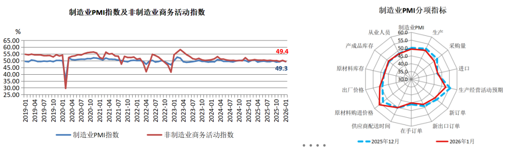 受春节返乡提前、内需偏弱等因素影响,2026年1月制造业采购经理指数(PMI)、非制造业商务活动指数和综合PMI产出指数分别为49.3%、49.4%和49.8%,比上月下降0.8个、0.8个和0.9个百分点,经济景气水平有所回落。2026年春节滞后于2月,短期来看,PMI或维持偏弱态势。但平均来看,近两月PMI指数仍延续前期修复态势,或反映开年经济良好。