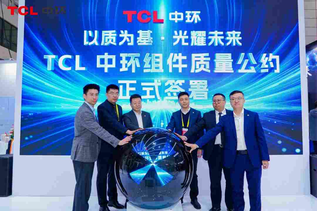 展会现场,TCL中环举行组件质量公约签署仪式,TCL中环电池组件事业部质量负责人陈锐发表主题演讲,倡导行业从 “价格竞争” 回归 “价值竞争”,秉持 “极致、领先、协同” 理念,以质量驱动产业增长。山东省光伏协会秘书长张晓斌先生、TÜV莱茵大中华区太阳能及商业产品服务首席技术官高祺以及TCL中环多位领导共同签署质量公约,向市场传递TCL中环坚守产品品质、推动行业高质量发展的坚定决心。