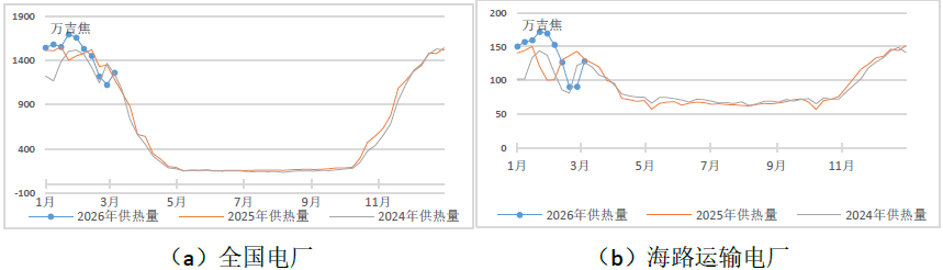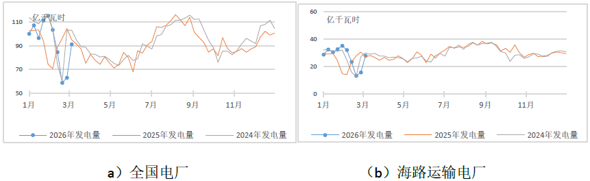燃煤电厂生产方面,受下游复工面扩大及阶段性低温天气影响,电厂发电量和耗煤量增长较快。根据中电联电力行业燃料统计数据,本周(2月27日至3月5日,下同),纳入统计的燃煤发电企业日均发电量环比(2月20日至2月26日,下同)增长44.4%,全国六大区域增长均20%以上,其中华东区域增长78.4%,全国同比减少4.0%;日均供热量1263万吉焦,环比增长12.3%,同比增长6.6%;日均耗煤量环比增长35.5%,全国六大区域增长均20%以上,其中华东区域增长72.5%,全国同比减少3.8%。其中,海路运输电厂日均发电量环比增长76.9%,同比增长3.1%;日均供热量环比增长41.7%,同比减少2.5%;日均耗煤量环比增长67.8%,同比增长3.7%。电厂库存量10402万吨,较2月26日减少627万吨;电厂库存可用天数较2月26日减少0.3天。